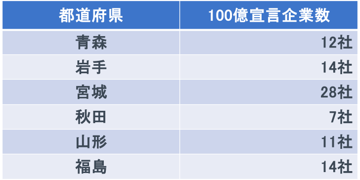 現在はいろんな金融機関で「100億宣言」への取り組みも注目されています。「100億宣言」は、「中小企業成長加速化補助金」への申請や、「中小企業経営強化税制(E類型)」の活用、「事業承継・M&A補助金」の上限額が上乗せされるなど、中小企業にとっては企業成長に直結する重要な取り組みです。金融機関として、こうした100億宣言企業をいかに支援していくかが重要なテーマになっているかと思います。実際、東北地域では青森から福島まで約100社が「100億宣言」を行っていますが、北日本銀行様ではどのような支援や取り組みをされていますか?
