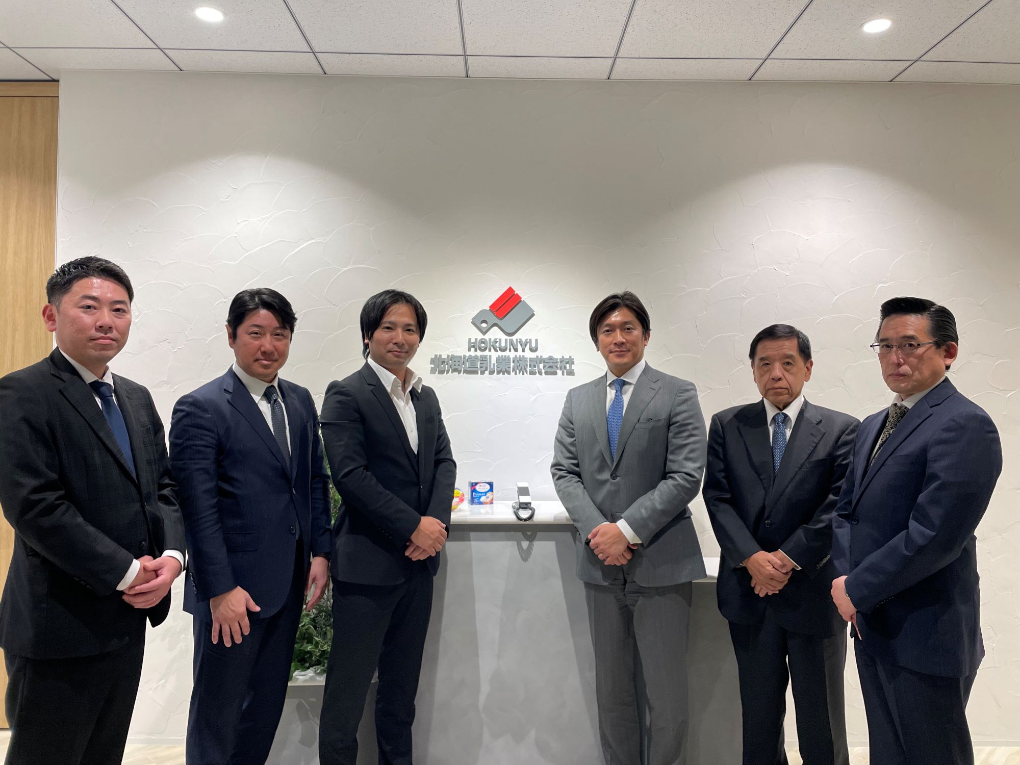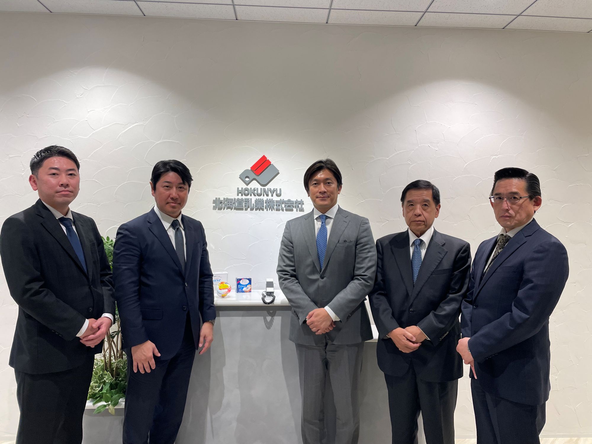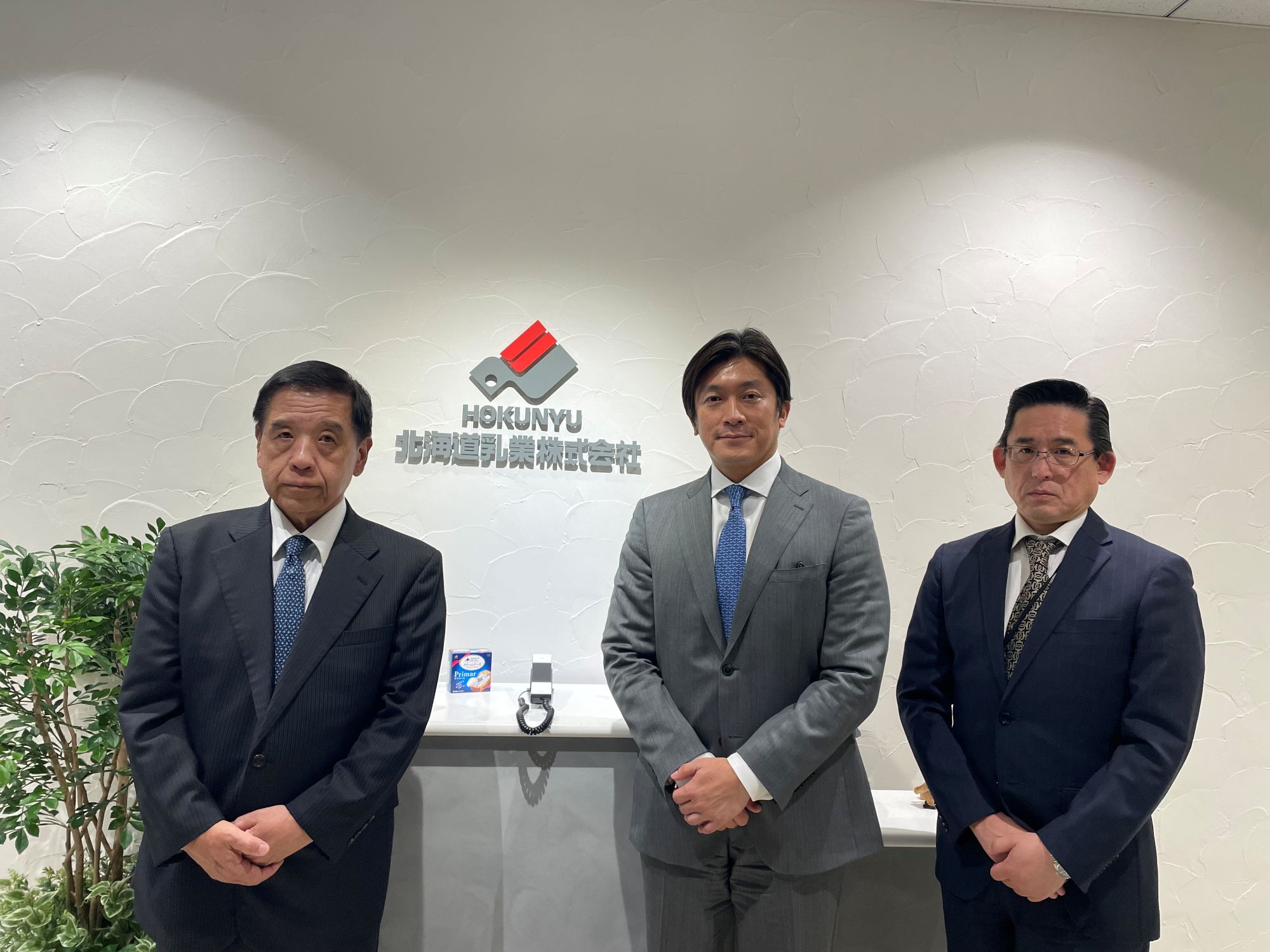 (写真左:北海道乳業 大槻取締役、中央:北海道乳業 田島社長、右:北海道乳業 近藤執行役員)