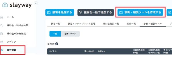 補助金クラウドの「顧客管理」メニュー内の「診断・相談ツールを作成する」をクリック